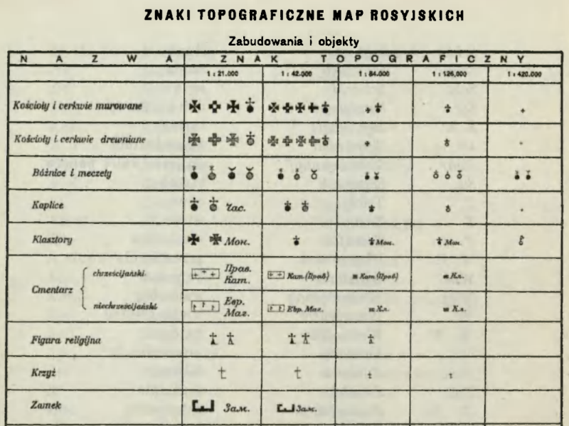 Zrzut z opracowania "Zestawienie znaków topograficznych map austriackich, niemieckich i rosyjskich" z 1925 r,